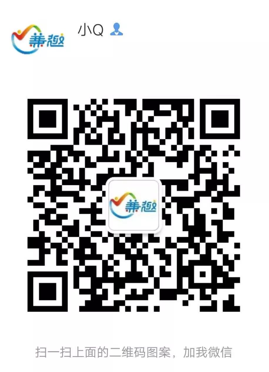 ☆PS:本条信息来自微信公众号“兼Qu”,若转载信息请注明出处!兼Qu官方客服微信号小Q上线啦,朋友圈将会为大家提供靠谱的工作信息,不定期也会送福利,扫描下方二维码添加小Q噢~